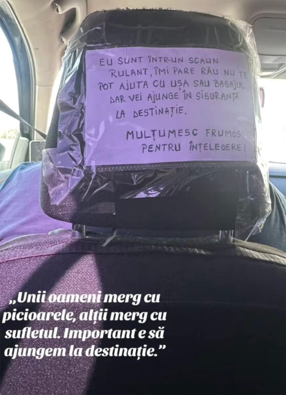 „EU SUNT ÎNTR-UN SCAUN RULANT, ÎMI PARE RĂU NU TE POT AJUTA CU UŞA SAU BAGAJUL, DAR VEI AJUNGE ÎN SIGURANȚĂ LA DESTINAȚIE. MULȚUMESC FRUMOS PENTRU ÎNȚELEGERE!”.